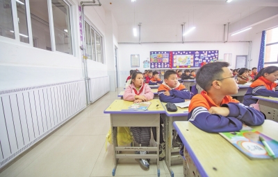 | 新桥小学学生在装有暖气片的教室内认真听讲。 |