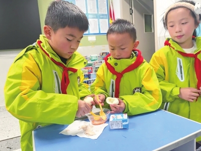 有了微辣的“灵魂”蘸料和积分激励,学生们吃鸡蛋从“任务”变成了“期待”。8岁的二年级学生涂子妤是变化最大的学生之一。“以前我特别不爱吃鸡蛋,蛋黄粘在牙齿上很难受。”她一边蘸着辣椒面吃鸡蛋一边说,“现在这个辣椒面不怎么辣,蘸着吃特别香,蛋白和蛋黄我都吃。”