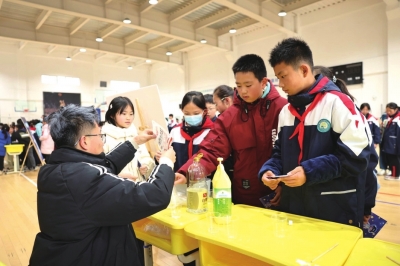 展演结束后,科学互动嘉年华将活动推向高潮。会场设置的8个打卡点前,学生们手持“筑梦科创”集章卡,兴致勃勃地穿梭于各个实验与挑战之间。