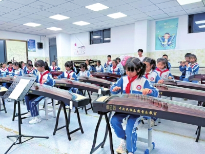 | 乡村学校的孩子们在音乐课堂上认真学习古筝。 |
