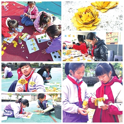 在落叶创作环节,学生们纷纷捡拾校园内金黄色的银杏落叶,在老师的指导下,运用双面胶、剪刀、超轻黏土、废旧纸杯、彩笔等材料开展创作。