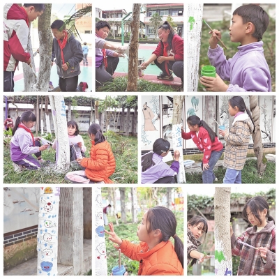 护绿绘美活动,学生们化身“护绿小卫士”,分工协作将石灰放入桶中,加入适量清水,用木棒搅拌均匀后,用刷子在树木主干离地100厘米处从上往下细致涂刷石灰水。待石灰干燥后,学生们拿起画笔,以冬至为主题,在刷好石灰的树干上勾勒心中美好图景,将劳动感悟与艺术创意完美融合。