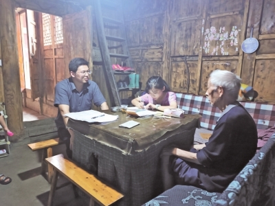 | 驻村第一书记刘赟博(左)到扶堰村曹安事家了解家庭情况,并为其孙女曹春雪申请助学金。 |