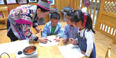 | 民间艺人在指导孩子开展蜡染活动。本报记者 熊江睿 高志杰 摄 |