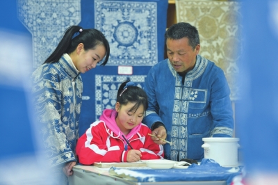 | 黔东南州黄平县湖里中学学生,正在接受非遗代表性传承人廖朝熙传授蜡染技艺。 梁文 摄 |