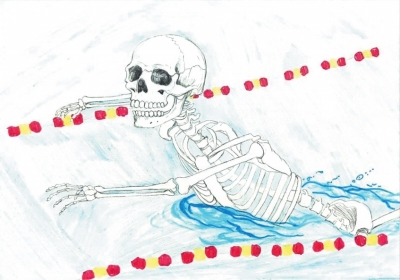 作品简介:作品以铅笔和彩铅为媒介,构建了一个充满隐喻的视觉叙事。画面中人体骨骼在淡蓝色的空间里呈现出一种漂浮的姿态,骨骼结构的刻画细致展现出对人体解剖学的精准把握。两侧红黄相间的珠串如生命的轨迹,与骨骼形成强烈的视觉与意象对比,蓝色的水纹则为画面增添了流动感与神秘氛围。