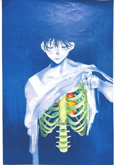 作品简介:画作基于人体解剖学和生理学原理,特别是心脏与骨骼系统的结构,准确地描绘肋骨和心脏的位置。作者将人体透明化,揭示内在生命力的象征——发光的心脏,年轻又赤裸的感情就像掀开衣服就能触及到的骨头抽生。这旨在探讨人类情感与生命本质之间的深刻联系。