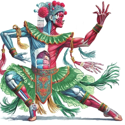 作品简介:作品以电子绘画的形式,将传统傩戏与人体解剖多元素有机结合。舞者优雅的姿势和健硕有力的骨骼肌肉与戏服的细节和人体结构特征相得益彰,整体画面表现出动态的美感和艺术的张力,从而凸显出人体内部结构的复杂性。