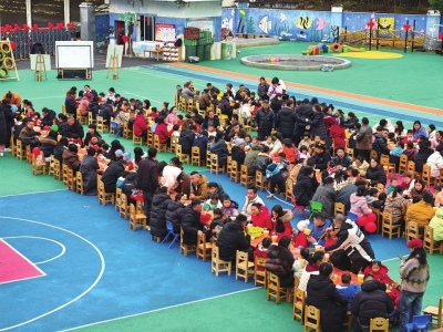 活动现场的主题海报、彝族民谣、教职工身着彝族服饰、彝族民俗和农特产品展示营造了浓厚的活动氛围,游戏区家长、幼儿和老师们玩得不亦乐乎、其乐融融,小小长桌宴上的杀猪饭美味可口。在系列活动中,小朋友们不仅体验了游戏的快乐、品尝了杀猪饭的美味,还感受到师生情和亲情的可贵、切身体会到“杀年猪、庆丰收、迎新年”的民族文化传承意义。