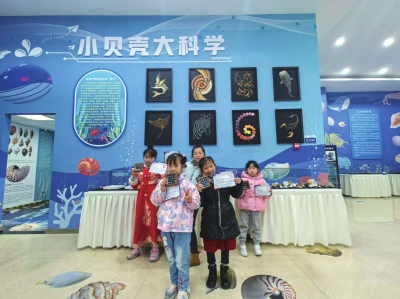 在科普老师的带领下,孩子们通过科普小故事,探究小贝壳里藏着的天文、地理、数学、美学等二十余门学科的自然密码,用五彩贝壳拼贴出属于自己的创意贝壳画,在趣味闯关任务里解锁贝壳知识,种下探秘海洋科学的种子。