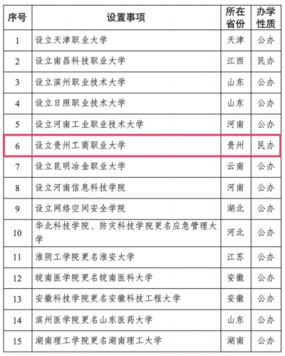 根据《中华人民共和国高等教育法》 《普通高等学校设置暂行条例》 《普通本科学校设置暂行规定》 《本科层次职业学校设置标准 (试行) 》等有关规定,经教育部党组会议审议,拟同意设置天津职业大学等15所学校,现予公示。其中,我省拟设立贵州工商职业大学。