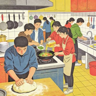 | 大学生在厨房抢着上劳动课。(AI生成) |