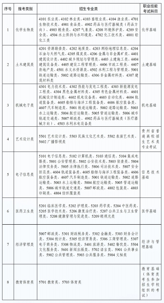2.技工院校毕业生参加对口升学统一考试,专业划分以省级人力资源社会保障部门公布的“贵州省技工院校专业对应对口升学统一考试类别及考试科目对照表”为准。