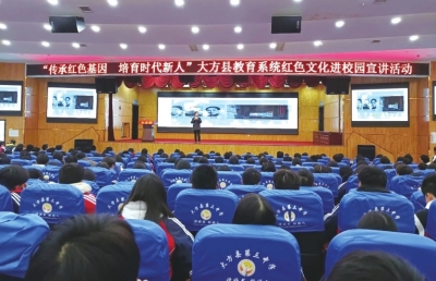 本报讯 (记者 陈瑞 特约通讯员 张伦勇)近日,以“传承红色基因・培育时代新人”为主题的大方县红色文化进校园宣讲活动,陆续走进大方一中、二中、三中、民族中学、实验高中和第九中学,生动鲜活的红色宣讲为2000余名学生带来了一场沉浸式的精神洗礼。