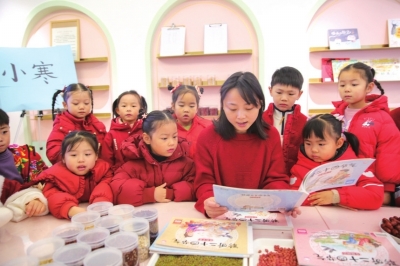 1月5日,在位于江苏省如皋市如城街道的新城幼儿园内,孩子们一起聆听小寒节 气绘本故事。