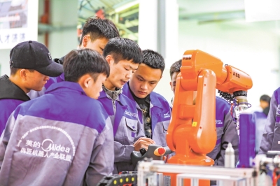 | 在贵州装备制造职业学院工业机器人综合实训室内,工业机器人技术专业的学生们在老师的指导下开展实训。贵州装备制造职业学院供图 |