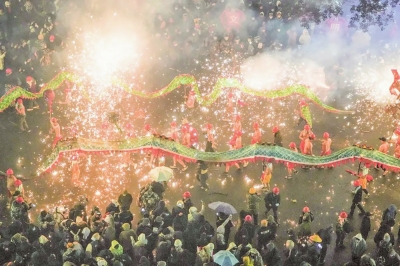 台江的上元灯夜,注定是个不眠夜。当晚笔者来到台江姊妹广场,活动尚未正式开始,广场口排队停着的车就已延伸到了一两公里之外。锣声、鼓声、爆竹声喧声贯耳,在广场空地等待入场的舞龙队伍,气势十足。带有LED灯的长龙,在夜幕下格外耀眼。19时30分左右,“飞龙在天”无人机表演正式开始。大量无人机飞向夜空,排列出苗族头饰、飞龙、投篮等多种图案以及“天下苗族第一县——台江”“苗族舞龙嘘花非遗大典”“筑梦苗乡 燃情台江”等字样,现代先进科技赋能传统节庆活动,让人惊叹。紧接着进行的祥龙点火仪式,为人们带来了一场烟花的狂欢。置身其中,不由想起唐代诗人苏味道描绘的《正月十五夜》:“火树银花合,星桥铁锁开。暗尘随马去,明月逐人来。”当“百龙竞技”争霸赛拉开帷幕,热闹、欢乐的气氛也被推向高潮。广场中央,人们携嘘花筒对游龙狂嘘,形成一片光艳四射的火海,舞龙者英勇无畏地在火海中跳跃奔腾。