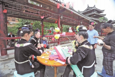 | 春节期间至元宵节前,台江的大街小巷、各村各寨便开始热闹起来,图为苗族妇女在制作“故事灯”。张奎 摄 |