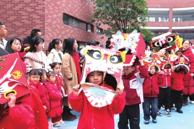 户外广场,好戏连台。铿锵的锣鼓声中,舞龙舞狮队伍翻腾跳跃,气势非凡;川剧变脸演员袍袖翻飞,瞬息万变的脸谱引得孩子们惊呼连连;杂技与腰鼓表演,则展示了力与美的传统技艺。掌声、欢呼声、惊叹声此起彼伏,构成最热烈的年节交响。尤为动人的是家园共育的场景:家长志愿者或扮演憨态可掬的“十二生肖”派发祝福,或参与传统乐器合奏,亲子同乐,其乐融融,共同编织出一幅和谐温馨的社区文化画卷。