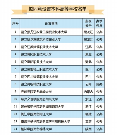 根据《中华人民共和国高等教育法》 《普通高等学校设置暂行条例》 《普通本科学校设置暂行规定》 《本科层次职业学校设置标准(试行)》 等有关规定,经教育部党组会议审议,拟同意设置黑龙江农业工程职业技术大学等14所学校,现予公示。
