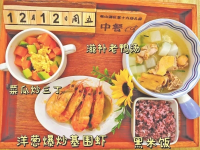 另一边的观山湖区第十九幼儿园,小朋友们也开心地端起餐盘,盛上了牛肉丝炒胡萝卜、香干炒菜心、鲜鸡鲍鱼菌菇汤,开启了一顿美味的午餐。