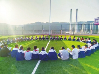漫步校园,崭新的楼宇与充满活力的操场相映成趣。尽管图书馆尚在蓝图,但阅读的种子早已处处萌发。教室里的图书角琳琅满目。黄昏时分,操场化为最美的露天阅览室:孩子们身着校服,沐浴着金色夕阳,在绿茵上围坐共读。远山如黛,晚风拂过书页,琅琅书声与自然清风合奏出一曲独特的“思源书香”。
