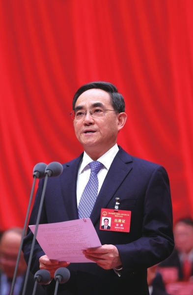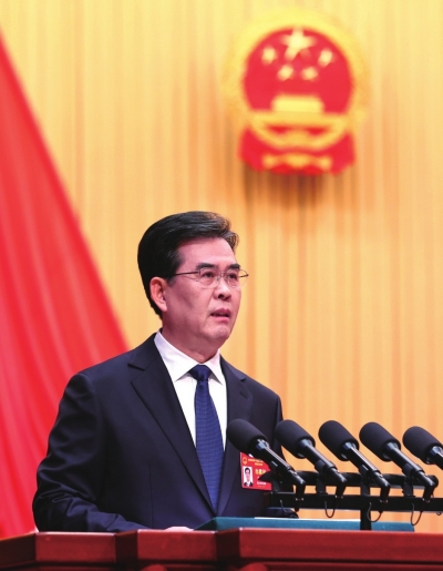 | 李炳军作政府工作报告。本报记者 李森 摄 |