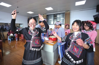 | 2025年11月12日,息烽县底寨中学石龙村民族文化进校园,陈丽老师带领学生在课堂上情景演绎-非遗抢鼓棒。 本报记者 邱凌峰 摄 |