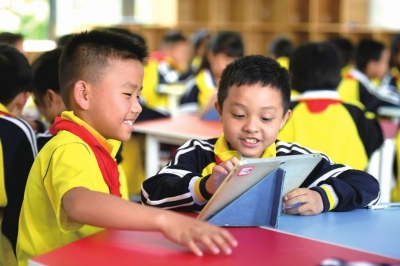 | 2025年6月24日,龙里县第七小学三年级 (2) 班学生在利用平板电脑学习英语。王立信 摄 (贵州图片库发) |