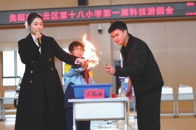 | 2025年12月30日,贵阳市白云区第十八小学学生在首届“科技进校园”主题公益游园会中体验“火焰掌”。 本报记者 邓刚 摄 |