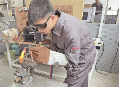 叶万文对设备维修与钎焊实训情有独钟。“这些课程‘最酷’、最贴近真实产业,也是我备赛的核心内容。”在他看来,现代制冷与空调技术早已超越简单维修,而是融合机械、电气、自动控制的复合型技术。从组件钎焊、设备拆装,到故障诊断与系统调试,全流程再现了企业生产流程。“每一次精准焊接、每一次成功排障,带来的都是技术解决实际问题的成就感。”在第三届全国技能大赛上,他凭借精湛技艺,斩获制冷与空调项目银牌,并荣获“西部技能之星”称号。