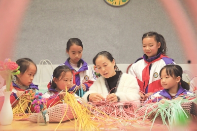 | 天柱县第七小学社团活动中,辅导教师向学生传授手工编织技艺。潘存栋摄(影像贵州) |
