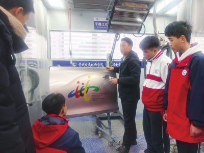 | 王庆为参加寒假集训的学生讲解汽车喷漆要点。 |
