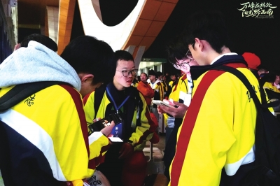 | 参加寒假科技冬令营的学生聚在一起讨论行程。 |