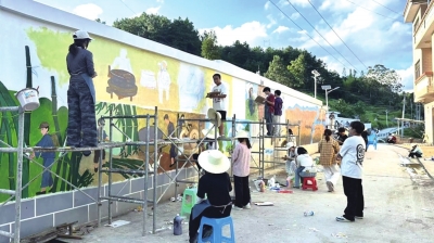 | 贵州黔南科技学院学生绘制墙绘现场。 |