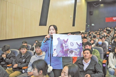 | 贵科院一堂思政课上,学生代表常小攀展示自己带着校旗站在四姑娘山顶的照片。 |