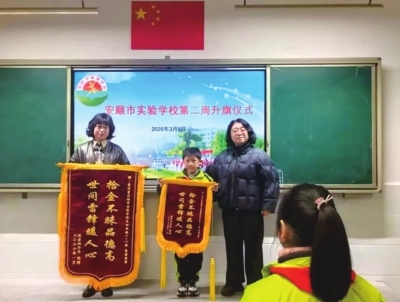 3月9日,在安顺市实验学校室内升旗仪式上,学校举行了表彰仪式。学校党委副书记、校长封葑为季熠颁发锦旗并全校通报表扬。