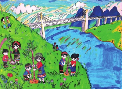 主题:这幅画以植树节为背景,描绘苗族小学生携手植树的场景,展现“民族团结护绿,童心共筑家园”的主题。孩子们身着色彩艳丽的苗族传统服饰,佩戴红领巾,在江畔山坡上分工协作,扶苗、培土、浇水,笑容专注而快乐。背景中,标志性的斜拉桥与喀斯特远山相映成趣,三岔河蜿蜒流淌,春花点缀草地,一派生机盎然。马克笔明快色彩凸显民族风情与自然之美,既传递环保理念,又彰显文化传承之意,洋溢着希望与活力。
