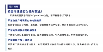 也有高校提醒:全校师生应结合自身实际需求理性看待该工具,切勿因跟风心理盲目安装、部署“龙虾”AI智能体,尤其避免在接入校园网的设备、办公电脑、存储有个人敏感信息和工作数据的设备上使用;校内各单位、教职工严禁在处理教学科研数据、行政办公信息、学生信息等工作场景中使用该工具,杜绝校园工作数据泄露、系统受攻击等问题,守住校园数据安全底线等。