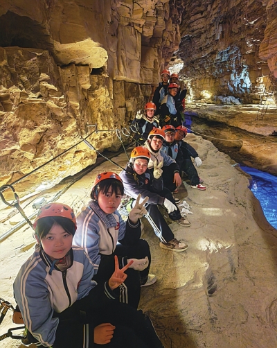 随后,研学队伍走进十二背后·双河溶洞景区,体验亚洲首条洞内飞拉达,开启勇气与体能的双重挑战。洞内钟乳石林立、暗河潺潺,是独一无二的“地心探险课堂”。