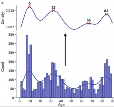 | 全生命周期大脑网络密度曲线(Density)及样本分布(Count),显示4个显著的年龄转折点:9、32、66、83岁。 图片来源于网络 |
