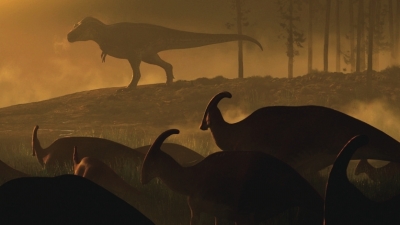 | 一只巨型暴龙正被鸭嘴龙科副栉龙注视着。新墨西哥州,白垩纪晚期,距今7400万至7500万年前。图片来自:Chase Stone |