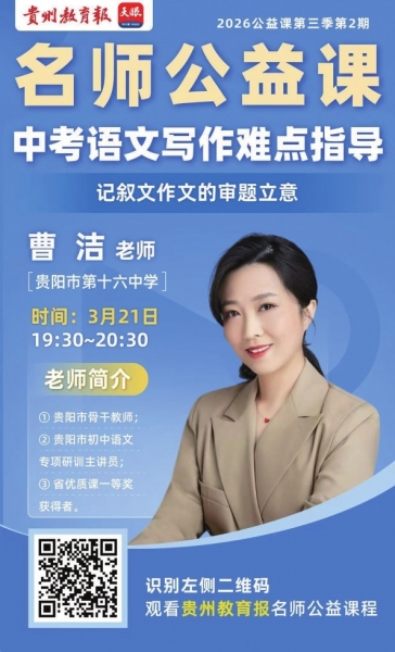 为助力2026届初三学子攻克中考语文写作核心难点,精准突破记叙文审题立意瓶颈,3月21日19:30-20:30,《贵州教育报》 联合南明区教育局、贵州师范大学基础教育研究院 (学院) 共同开展的名师公益课第三季第二期即将开播。本期特邀贵阳市第十六中学骨干教师、省优质课一等奖获得者曹洁老师,聚焦中考记叙文审题立意专题,结合七年中考阅卷经验,拆解贵州考生写作痛点,传授实用解题技巧,为全省初三学子送上百日冲刺专属备考攻略。