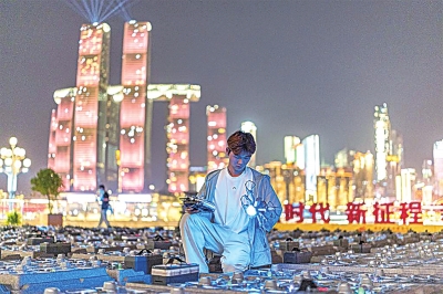 | 在重庆市南岸区,无人机群飞行规划员陆子祥在检查即将执行飞行表演的无人机状态(2025年5月1日摄)。新华社记者 黄伟 摄 |