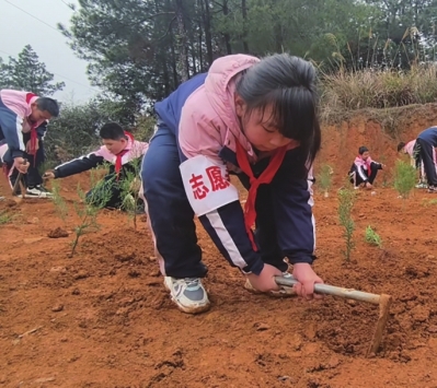 活动还设置了“先锋林”植树环节。学生们挥锹铲土、扶苗填坑,亲手种下100余棵象征希望的树苗,并在标签上写下对未来的承诺:“十年后,我要带着建设祖国的本领来看你!”这一棵棵树苗,既是生态文明的播种,更是红色精神的延续。