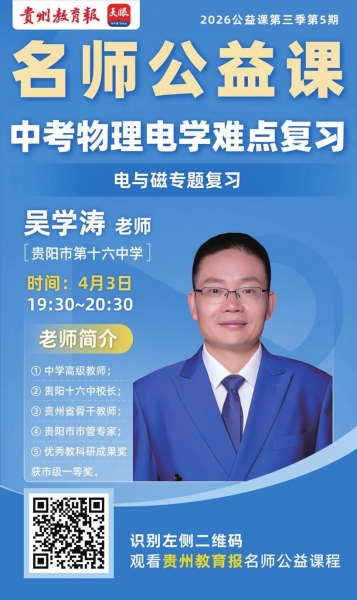 4月3日19:30,锁定 《贵州教育报》 名师公益课直播间,跟随吴学涛校长攻克电与磁复习难点,以科学方法备战中考,从容斩获理想成绩!