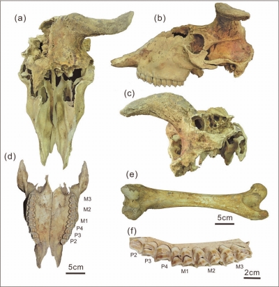 | 在贵州绥阳双河洞区域科考发现羚牛化石的头骨、股骨及上颌齿列的标本图。 受访者供图 |