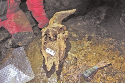 | 在贵州绥阳双河洞发掘现场发现的羚牛头骨。 受访者供图 |