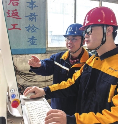 | 陈义锋(右)跟高军永老师学习铝电解工艺。 |